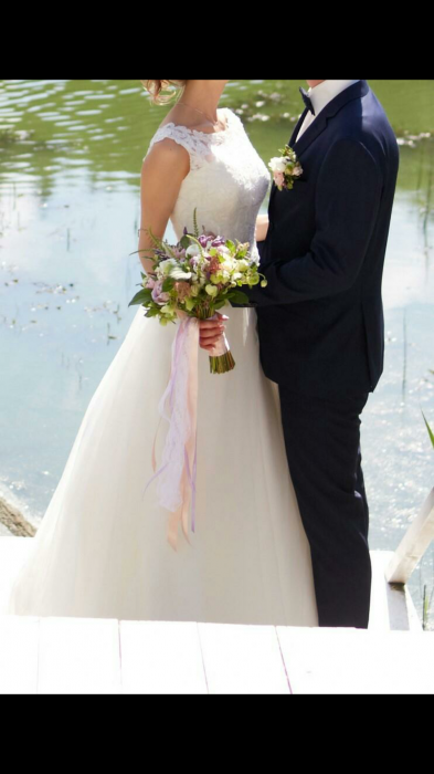 Свадебное платье размер 42. Есть чеки на платье и химчистку Зеленоград или Москва по договоренности (речной вокзал). Свадебное платье сшитое в Испании (в единственном экземпляре). Вместе с платьем отдам подъюбник с 1 кольцом и белые бонбоньерки. Платье в идеальном состоянии (состояние нового) после химчистки, без дефектов, отпаренное. Параметры: Бюст: 86-90 (чашка 2 -2.5 р-р) Талия: 65 Бедра: 90 Рост 175 (Длина платья с учетом каблука примерно 183 см). Фотографии настоящие, готова дополнительно.