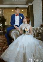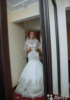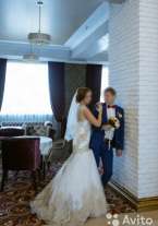 Волшебное свадебное платье цвета айвори, расшитое лёгким золотом. Покупала новое в салоне. Силуэт - рыбка (с годе). В комплекте фата с гребнем и подъюбник. В платье по улице не ходила, только в ЗАГСе и ресторане, в следствии чего нет никаких повреждений. Платье после химчистки. Сзади корсет на замке и пуговицы. Корсет регулируется по фигуре, за счёт чего на талии платье сидит идеально. Покупала за 60 000 тысяч. Цена - 50%. Мой рост 170, под небольшой каблук платье по садится по росту.