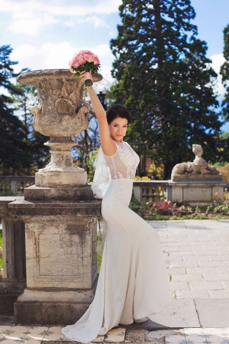 В абсолютно идеальном состоянии. Дизайнерское платье от Марии Брайд. Силуэт - рыбка. Цвет айвори, красивый шлейф, верх - кружево на сетке, низ - плотный шифон. На талии поясок. Платье очень красиво подчеркивает фигуру. На рост 168 см (без каблука). Размер 40 (80-65-90) на миниатюрную стройную девушку. Цена платья 32 000 руб. (покупала за 40 000) Также имеется фата, идеально подходящая под платье, цена фаты - 2000 руб. Примерка в любое время. М. Отрадное.