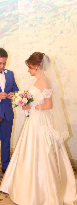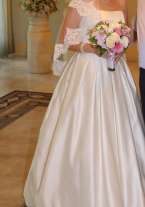Приталенное свадебное платье с небольшим шлейфом. Свадебное платье выполнено из матового атласа высочайшего качества. Кружевное болеро. За счет того, что болеро съемное, можно на свадьбе быть то в одном образе с закрытыми плечами, то в другом - с обезоруживающим декольте. Пояс также декорирован жемчужинками и небольшим количеством страз. Модный в сезоне фасон юбки в крупную складку дополняют внутренние карманы.