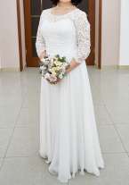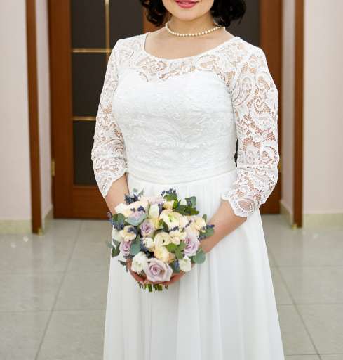 Белое свадебное платье с кружевными рукавами, закрытой спиной, с кружевным корсетом и струящимся низом. Прекрасно вытягивает фигуру, утягивает талию, также скрывает покатые плечи и руки. Идеальный вариант на 48 размер. Прекрасно подойдет для осени, зимы, весны. Продаю без химчистки (для чистки только низ юбки), с чехлом.