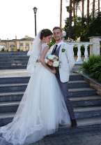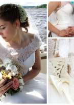 Платье - нежный айвори с элегантным кружевом без обилия деталей+фата. Спинка со шнуровкой и изящным бантом, ленты которого опускаются до самого подола. Шлейф с кружевом, кстати, никак не мешал при ходьбе. Внутри мягкая хлопковая подкладка, к телу очень приятная, ничего не стесняет движение, не доставляло дискомфорт. Юбка не шуршит, на ощупь очень приятная, не жесткая. Да и ещё, как оказалось, очень качественная - ни одного порыва. По фигуре сидит очень складно. Состояние идеальное, после химчистки.