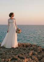 Нежное свадебное платье с длинными кружевными рукавами и юбкой из атласа. Кружевной корсет с закрытой зоной декольте идеально садится по фигуре. Талия подчёркнута широким атласным поясом. Платье ждет счастливую невесту=)