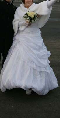 Одевалось один раз, вообще подойдёт от 44-50 размера, при моем росте 160 и каблуке 10 см, я снизу зацепляла. Прилагаю накидку меховую, перчатки и кольца под юбку.