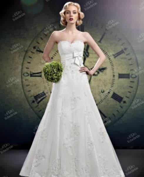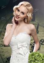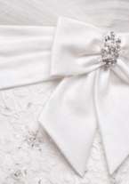 Модель по всей длине декорирована кружевом, в центре изящного банта нежно сияют жемчужины – платье за гранью сказки! Ткани и отделка: фатин, атлас, кружевной декор с пайетками и бисером; под грудью – атласный бант с декором из страз, камней и жемчуга. Надевалось на пару часов, потом переоделась в другое.
