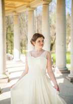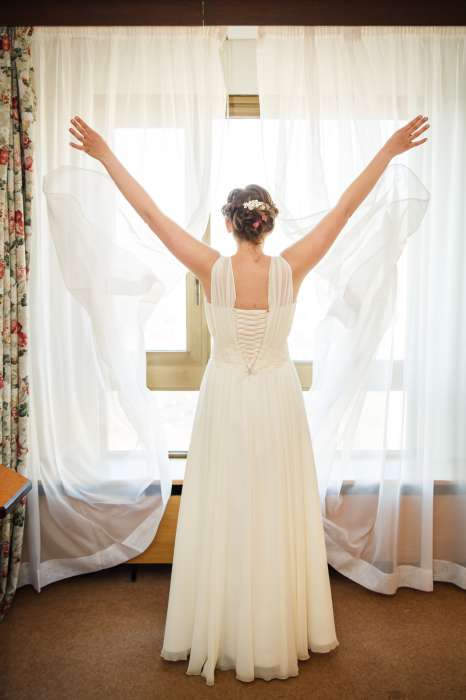 Легкое, струящееся свадебное платье в греческом стиле. С верхней шифоновой юбкой и мягким корсетом. Корсет отделан фактурным ажурным кружевом. Прямые плиссировки спереди, расходящиеся от талии. Талия завышенная, удачно подчеркивает силуэт. Мягкие бретели, шнуровка на спине. Удобное, не сковывает движений. Надето 1 раз, в химчистке не было.