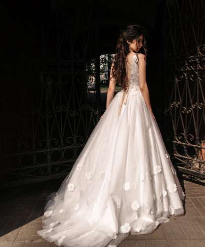 Свадебное платье А-силуэта декорированное аппликацией из цветов. Открытый верх, спина на шнуровке. Цветы расшиты миниатюрными сверкающими пайетками. Шлейф 70 см. Основной материал: фатин После Химчистки, в идеальном состоянии. К свадьбу прилагаю нижнюю юбку-кольцо, а также абсолютно новую диадему. Платье в фирменном чехле салона "Мэри Трюффель"