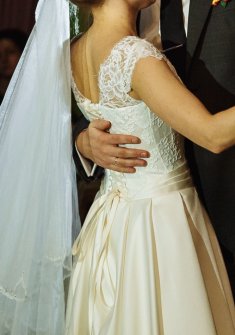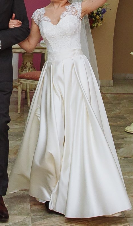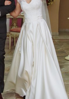 Свадебное платье б/у. А-силуэт. Цвет Айвори. Материал юбки - атлас, материал верха - кружево поверх корсета. Размер 38-40. Объем груди 76-80 см. Обхват талии 60-64 см. Высота корсета по спине 25 см. Рост 155 см + каблук 8 см. Покупалось в магазине Anna Bogdan в августе 2017 году.