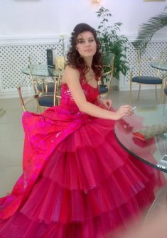 Платье Цвета фуксия, безумно красивое, не тяжелое, Двухъярусное, нижняя часть отстегивается, оставляя шлейф сзади (его можно делать в варианте полной длины или покороче подстегивая петлей на пуговичку и делая фалду) и впереди остается два яруса фатина - длина примерно по колено. Сзади шнуруется, утягивая на нужный объем. На фотографии размер 44, росто 170 + небольшой каблук 7 см было куплено в салоне Плюмаж на Кутузовском проспекте за 200 т.р., надето один единственный раз, состояние идеальное.