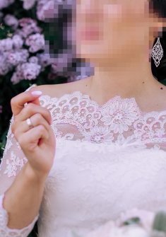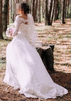 Свадебное платье Ladianto, модель Luca цвета айвори, классический А-силуэт, с очень красивым кордовым кружевом, рукав 3/4, удлиненный корсет на шнуровке. Подойдет для венчания. Размер 44-46, подгонялось под рост 163 см + каблук 11 см, но можно укоротить (кружево по низу наставное). Платье в идеальном состоянии, покупалось год назад в свадебном салоне в Москве за 50 000 руб. Надевалось 1 раз, после была сделана химчистка. В подарок фата "Капля", белые туфли р37 и чехол к платью.