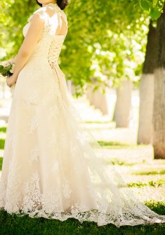 Автор Таня Григ (Tanya Grig), модель Одри (Odri), покупалось 2013. А-силуэт, юбка не пышная, шлейф, линия выреза под горлышко, рукава короткие, цвет капучино; на шнуровке и молнии, не корсетное, размер 48, мой рост на фото: 164 см + 6 см каблук. Надевалось на 4 часа для ЗАГСА и фотосессии, не венчанное. В химчистке не было. Вместе с перчатками отдаю. К потенциальному покупателю привезу платье на дом для примерки, так как у меня дома к сожалению для примерки места нет. Жду в личные сообщения.