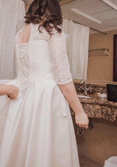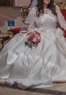Свадебное платье размеров 50-52, но может подойти на 54, цвет айвори, кружево и атлас, юбка в несколько слоёв. Мой рост 168 см., на фото я не на каблуках. Отдаю вместе с книгой для пожеланий, вешалкой «Невеста» и двумя бокалами для молодоженов, свечи для семейного очага. Так же в отдаю: фату, кринолин, чехол, сумку. Сразу предупреждаю - подолу требуется хим.чистка, в самом низу немного испачкан. Самовывоз м. Бабушкинская (8 мин. от метро)