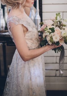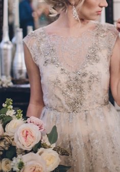 Рост от 1,60 см (обувь с каблуком) до 1,70 см (обувь без каблука) Дизайнер: Таня Кочнова. Платье по индивидуальному дизайну из натурального шелка, шифона, органзы и кружева. Ткани закупались в Европе. Платье состоит из верхнего и нижнего. Нижнее платье - это шелковая база нежно персикового цвета, которая помогает делать верхнее платье совсем прозрачным с кружевными и вышитыми элементами. Цвет верхнего платья - дымчатый. Платье надевалось на свадебную вечеринку.