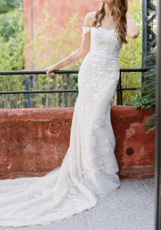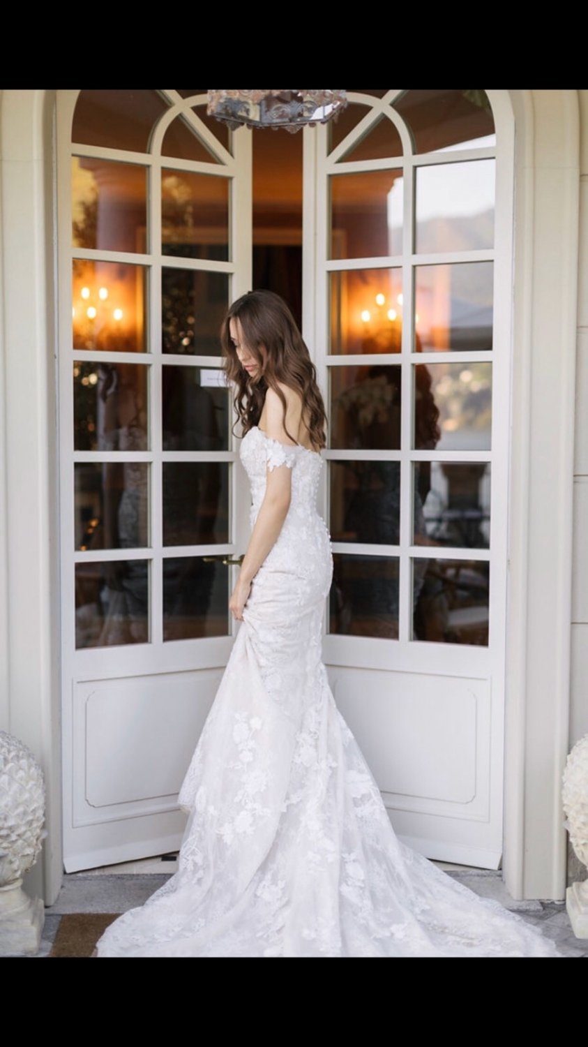 Свадебное платье бренда Pronovias Коллекция Весна Лето 2018. Платье в жизни намного шикарнее, чем на фото, в нем удивительный длинный шлейф, много кружевных слоёв, белый соединяется с айвори, которые создают необыкновенный эффект. Могу по запросу отправить видео и дополнительные фото. Платье немного садили на фигуру. Покупала в фирменном салоне Pronovias в Милане за 3000€. Бирки чеки чехол в комплекте.