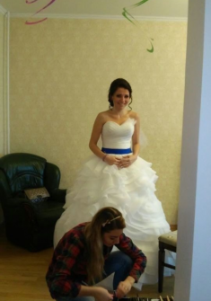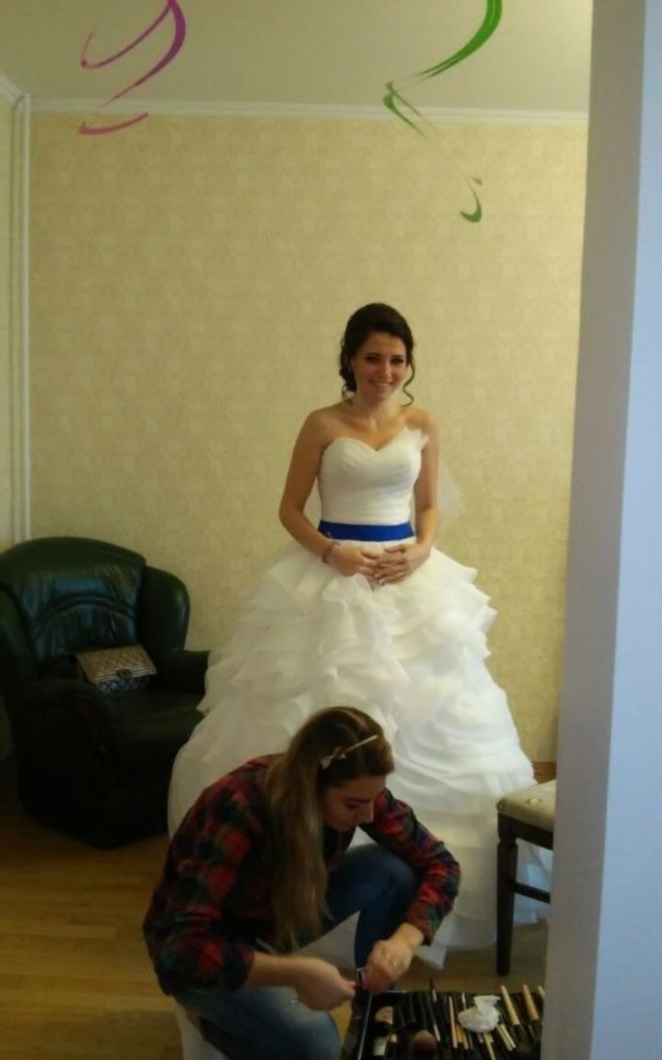 Пышное свадебное платье без бретелей с вырезом на лифе в форме сердечка цвета айвори. Корсет задрапирован широкими складками, идущими крест-накрест. Синий пояс украшает талию, его можно заменить на любой цвет. Пышная юбка из органзы затейливыми ярусами спадает до самого пола, напоминая цветок розы и переходит в длинный шлейф, который можно закрепить на поясе, тем самым сравнять длину платья.