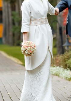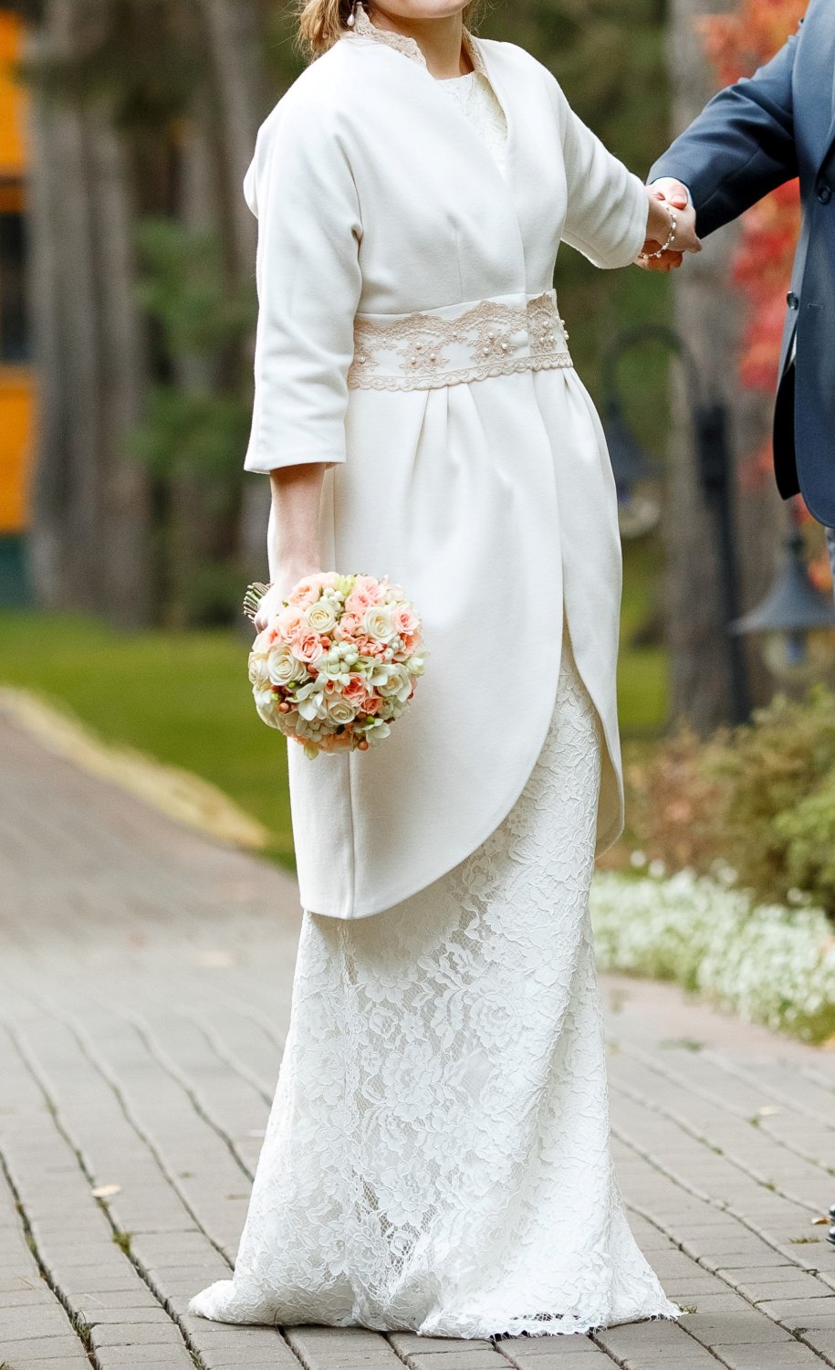 Продаю свадебное пальто от российского дизайнера Diana Pavlovskaya. Итальянский кашемир молочного цвета, рукав 3/4, верхняя часть до талии имеет подкладку, линия талии и воротника декорированы кружевом и вышивкой. Было сшито на заказ и надето только на свадебное торжество.