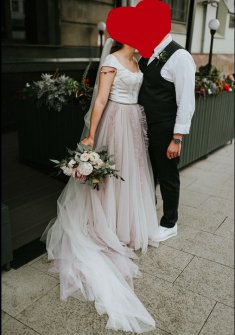 Платье от Рара Авис А-силуэта с закрытыми плечами и открытой спиной. Застежка майки по горловине спинки из бисерной нити. Линия талии подчеркнута бархатным пояском, который завязывается сзади на бант. В качестве декора цветы из японской глины ручной работы и бисерные нити. Шлейф 30 см. Основной материал: фатин, бархат. Покупалось в салоне Мери-Трюфель: https://marytrufel.ru/svadebnoe-platye-rara-avis-molin Продаю с чехлом салона и фатой! Торг уместен.