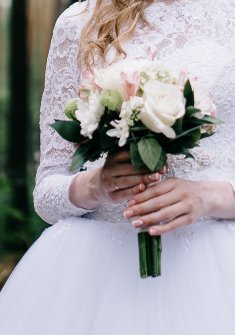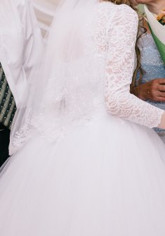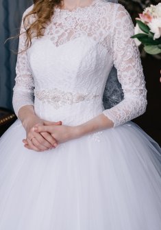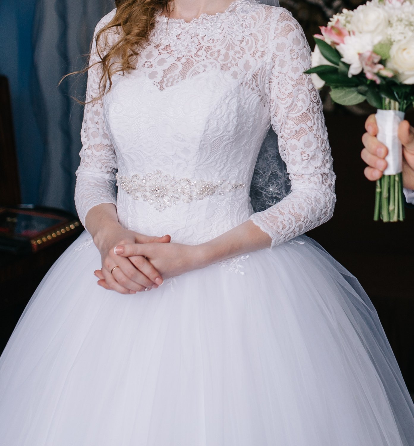 Свадебное платье А-силуэта с закрытыми плечами и длинными рукавами, расшитыми кружевом на тонкой телесной сетке. Изготовлено из высококачественного материала. Основная отличительная черта этого платья – пышная юбка. Верх представляет собой корсет, плотно обтягивающий отрезной по талии лиф. Безусловно, эта модель платья одна из самых популярных. Размер: 42-44. Цвет: белый/айвори