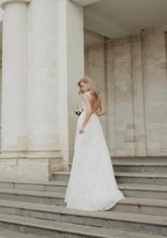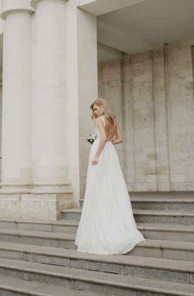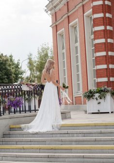 Свадебное платье с открытой спиной, небольшим шлейфом. Украшено вышивкой и бисером. Нежное и очень стильное.
