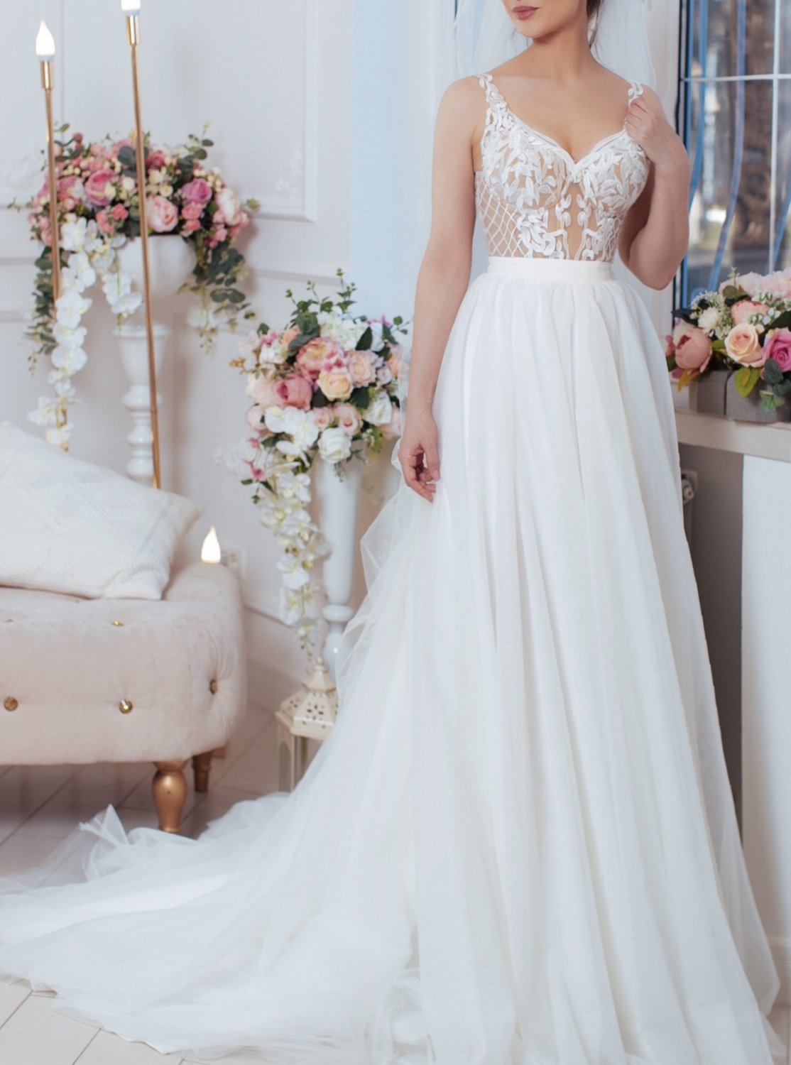 Платье в идеальном состоянии, надевалось 1 раз в помещении буквально на регистрацию. Фотографии реальные. В подарок идут длинная фата и болеро с длинными рукавами из того же кружева, что и корсет. Платье безумно жалко отдавать, но хочется, чтобы эта красота еще кого-то порадовала. Идеально подчеркивает фигуру.