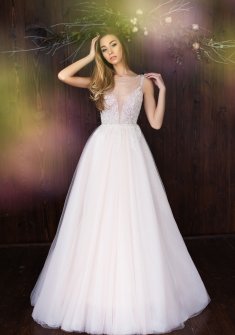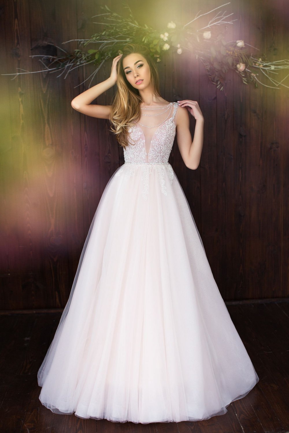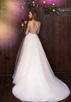 Белоснежное платье А-силуэта с открытой спиной, со шлейфом после химчистки. Бренд Daria Karlozi Коллекция Нежный Цветок Платье 08051 Courageous Carnation Многослойная юбка со складками дополнена роскошным ниспадающим шлейфом, а расколотый корсет с открытой спинкой покрывают тонкие вставки и изысканные узоры бисерной вышивки. Акцентом образа стали легкие перекрещенные цепочки на открытой в V-образном вырезе спине.