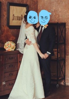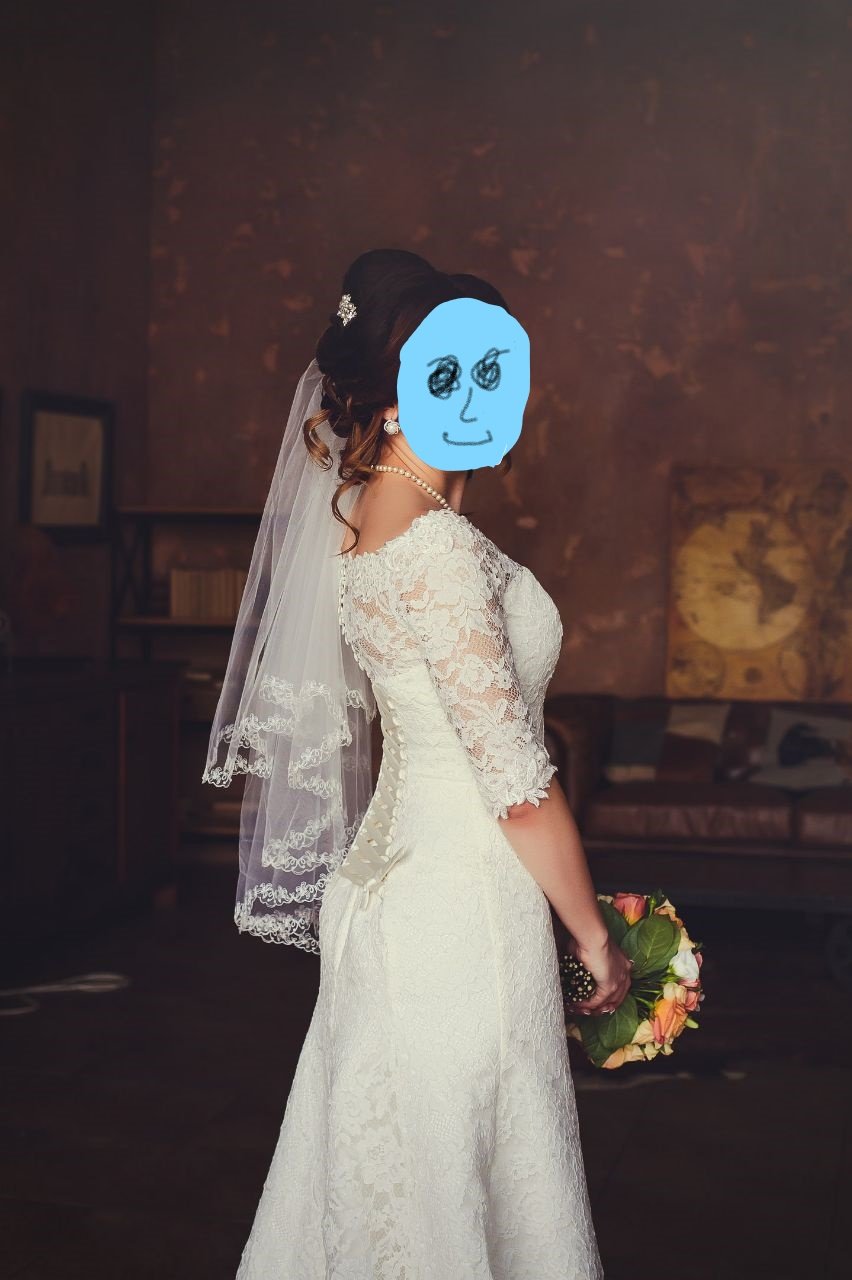 Счастливое платье цвета айвори GABBIANO. Свадебное платье создаёт благородный образ невесты, пропитанный женственностью и трогательностью. Соблазнительный корсет с вырезом в форме сердца имеет изящный кружевной декор, который образует элегантные рукава 3/4. Платье выполнено из атласной ткани и нежного кружева расстилающегося до самого шлейфа. Платье после химчистки, состояние идеальное. В подарок - фата и украшение для волос)