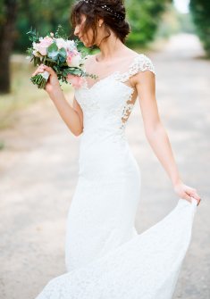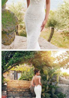 Свадебное платье облегающего силуэта, основной материал кружево. Модель русалка. На спинке пуговицы. Платье молочного цвета в идеальном состоянии после химчистки.