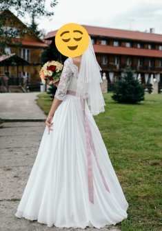 Продаю красивое выдержанное свадебное платье А-силуэта, цвета айвори, которое также подойдет для венчания в церкви. Верх платья расшит мягким кружевом, низ - элегантная длинная юбка из воздушного шифона, спинка на европейской шнуровке. В комплекте нежный розовый поясок, декорированный кристаллами Swarovski, хрусталем, жемчужинами и бисером разных размеров и форм, что позволяет подчеркнуть изысканность каждой детали. Приобретала в салоне свадебных платьев "Дом Весты". Бренд платья Jasmine Empire.
