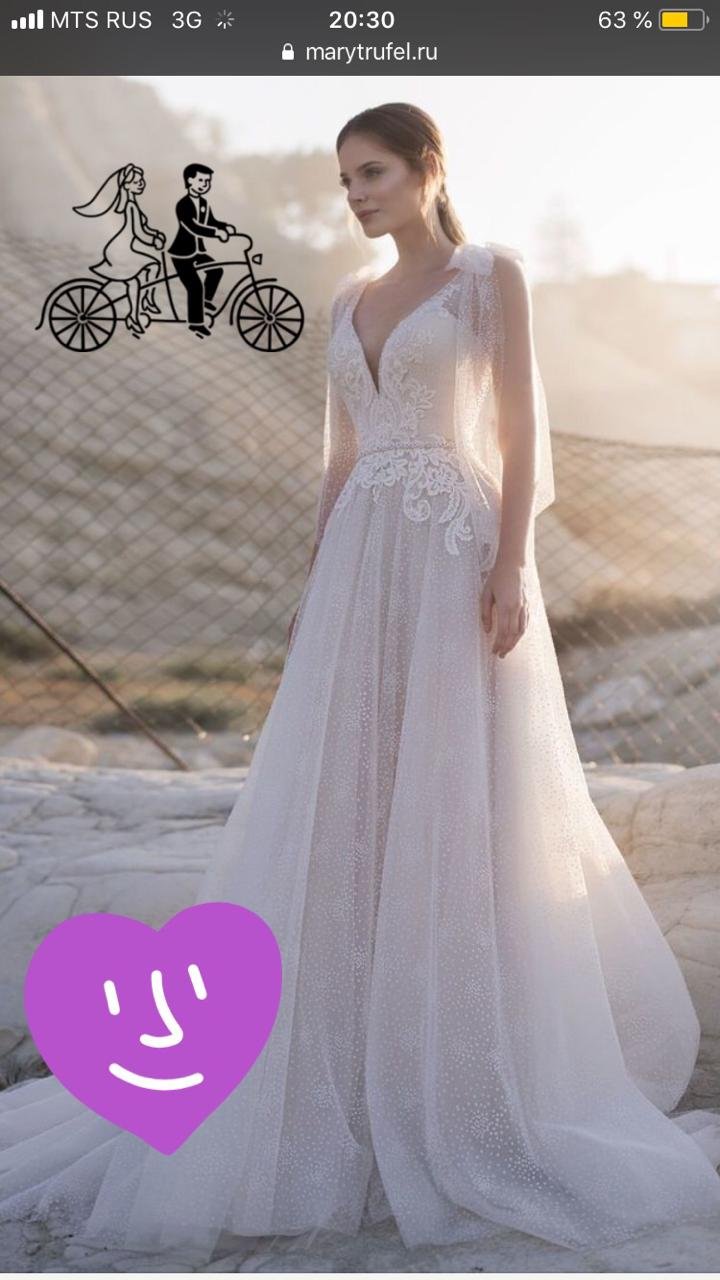 Свадебное платье А-силуэта с завязывающимися в бант бретелями и открытой спиной на застежке-молнии. Шлейф 50 см. Основной материал: кружево