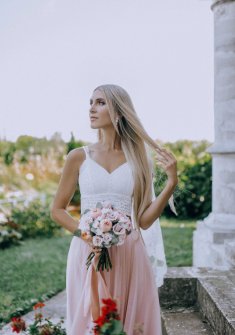 Легкий свадебный наряд, идеально подходит для церемонии на море, юбка цвета розовая пудра и белоснежный топ. Было надето один раз на послесвадебную фотосессию, не надевалось в ЗАГС. После химчистки. Для восхитительно красивой, нежной и оригинальной невесты! Звоните в любое время или Whats App, привезу на примерку по Москве или Дмитров, Лобня, Дубна бесплатно.