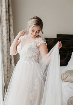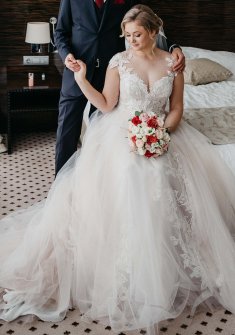 Корсетное платье, юбка фатин, также есть фата. Надевала один раз пару месяцев назад. Платье в хорошем состоянии хранится в шкафу. Есть чехол и вешалка к платью.