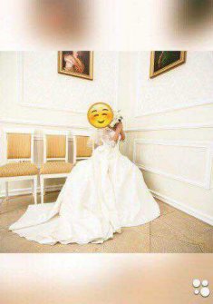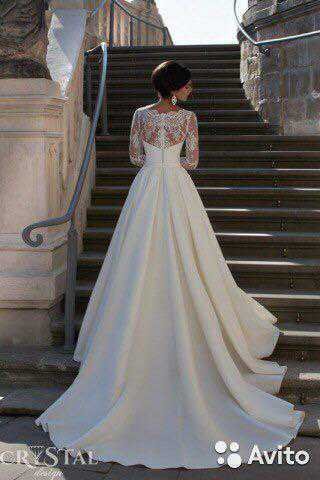 Безумно красиво платье А-силуэта, V-образный вырез, шлейф, нежные кружевные рукава, атласная юбка, цвет айвори. Платье очень удобно и быстро надевается (сзади молния). Также есть крючок для того, чтобы убрать шлейф. По своему желанию я немного изменила платье от его первоначального вида (укоротили рукава до 3/4). Платье в отличном состоянии, после химчистки, без повреждений и зацепок. В подарок отдам подъюбник с 2-я кольцами.