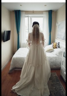 Свадебное платье в идеальном состоянии, 44-46 размер. Со шлейфом, шлейф небольшой, очень удобное платье и безумно красивое, было сшито на заказ. В подарок идёт фата, подъюбник в 2 кольца и чехол на платье. Сзади корсет с молнией совсем не видно и пуговки, очень красиво смотрится. Возможен торг