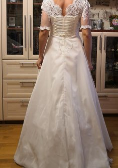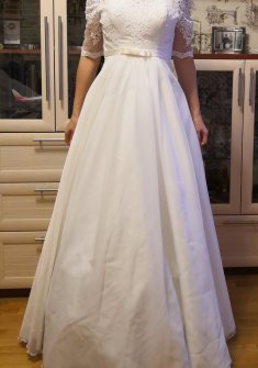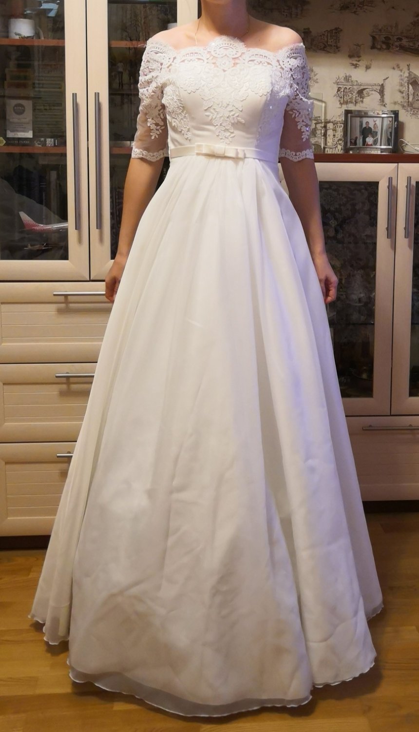Платье абсолютно новое. Цвет "айвори" (слоновая кость). На кружевном лифе пайетки. Сзади на молнии полюс шнуровка. В подарок чехол для платья, кринолин (2 кольца), новая фата.