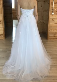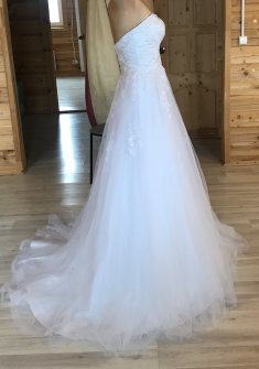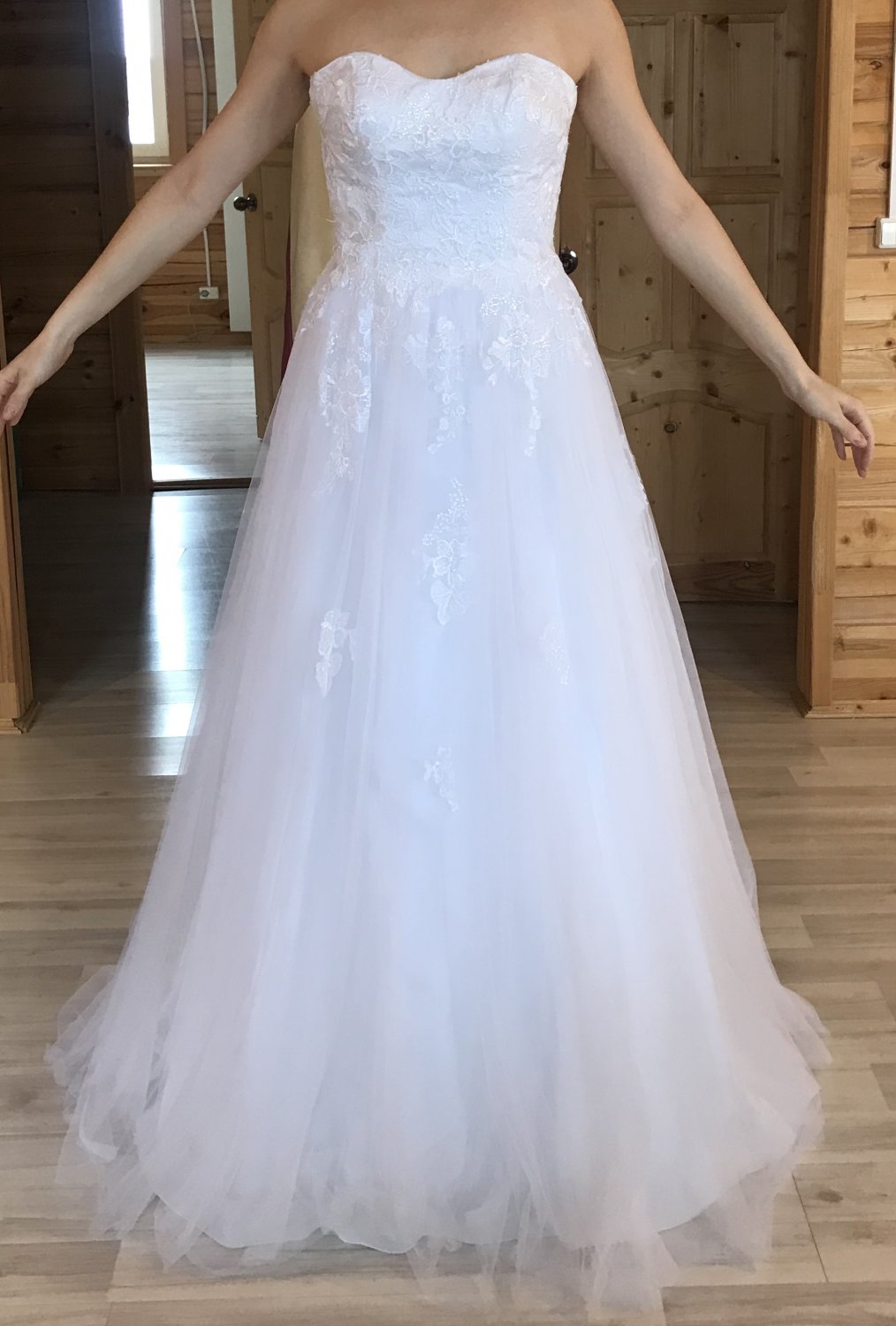 Свадебное платье бренд To Be Bride, А-силуэт, белое, со шлейфом, также есть подъюбник с одним кольцом, фата, подвязка. Весь комплект от одной фирмы. Была химчистка. Торг уместен.