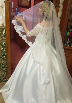 Классическое свадебное платье модной марки Naviblue Bridal, размер 34 (российский 40-42). Атлас, объемное кружево, верх - жесткий лиф (не требует ниж.белья) с обнаженными плечами переходящими в рукава 3/4, низ - пышная юбка, спинка украшена мелкими обтянутыми атласом пуговичками. Вместе с платьем отдам длинную, в пол, фату с кружевом и подвязку на ножку невесты. Платье в отличном состоянии, проведена химчистка (есть бирка). Покупалось для Бала и не подошло по цвету.