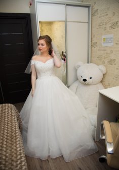 Подойдёт на низенькую миниатюрную девушку 150-155 см (+ каблуки). Носилось один раз мною, после свадьбы прошло химчистку. В идеальном состоянии. Просьба писать в Вотсапп, сообщения