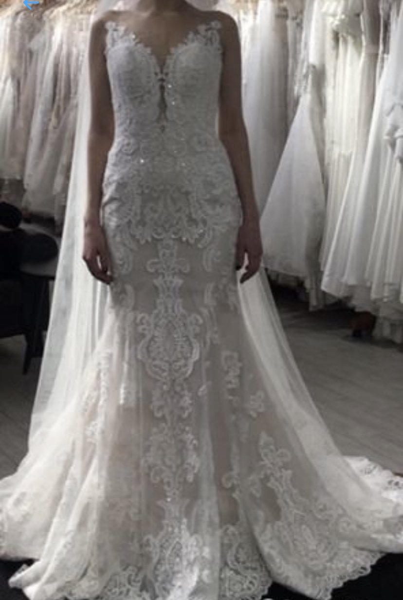 Платье-рыбка со шлейфом, сзади застежка на молнии, задекорированная пуговками. Дополнительно в комплекте юбка, которая добавляет длину шлейфу и воздушность платью, если хочется изменить образ. Платье как новое, после химчистки.