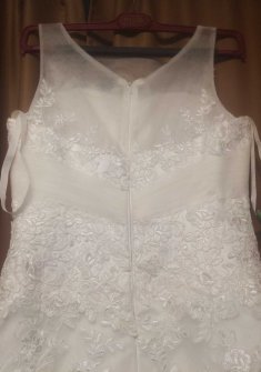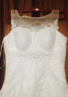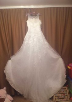 Платье цвета айвори, у платья имеется длинный шлейф, застёгивается на молнию, под грудью есть вышивка из бисера, а на самом платье — кружево.
