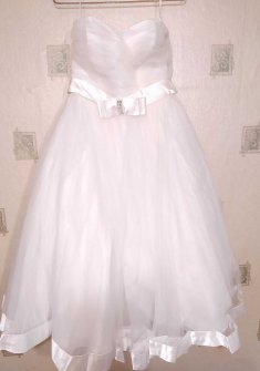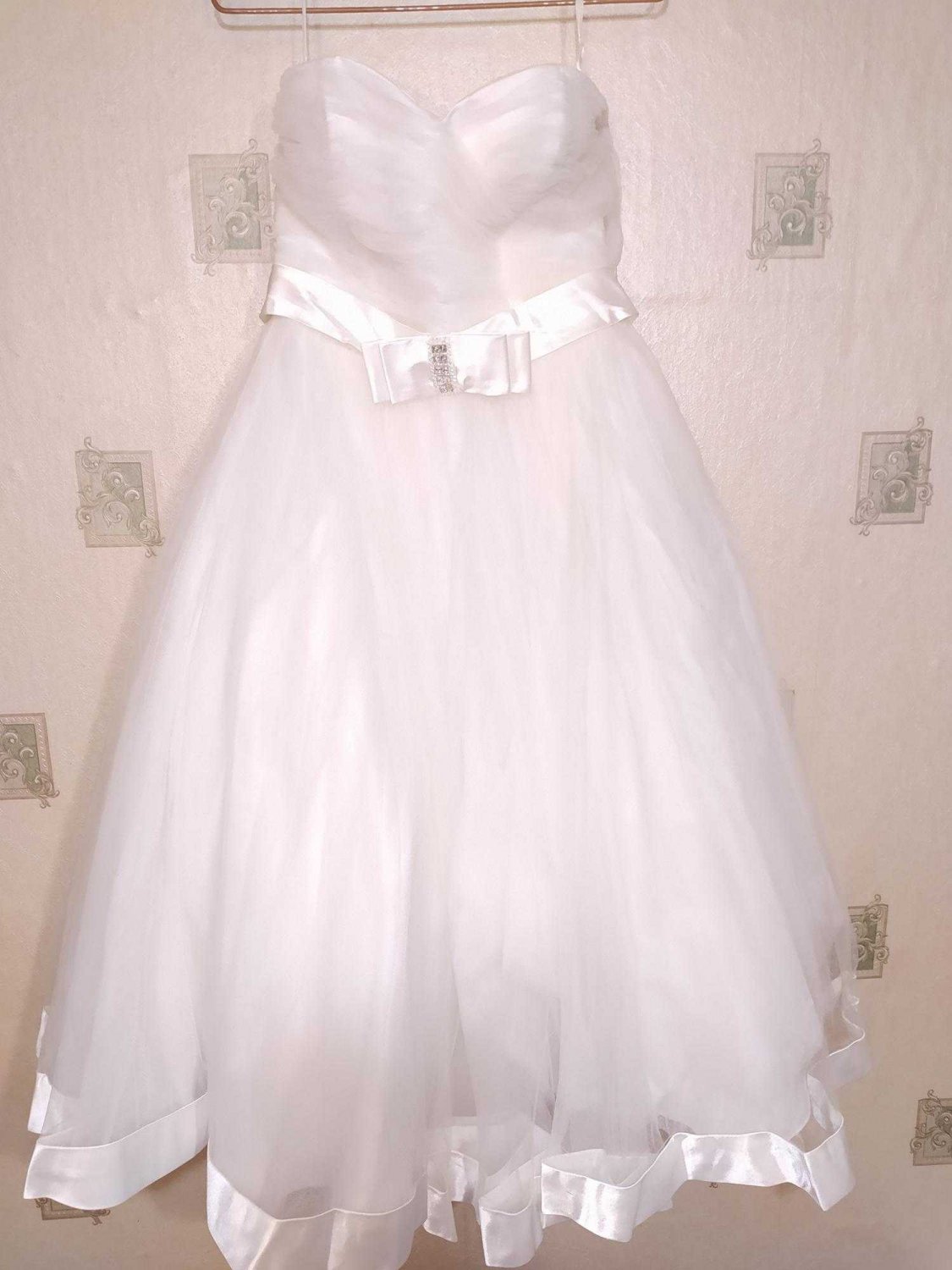 Короткое свадебное платье. Длина 100 см. Цвет айвори (почти белый). Корсет на шнуровке, есть спец вставка, которая закрывает спину, поэтому под шнуровкой спина не голая. Платье очень нежное, объёмный и воздушный низ. Материал: атлас и фатин. Размер 42-44. Состояние нового. Без дефектов.
