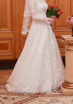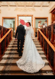 Кружевное платье на завязках. В химчистку не сдавала и не планирую. Без торга. На рост до 170-175 примерно. К платью идет 1 кольцо (подъюбник). А-силуэт. Со шлейфом, который можно закрепить на большую красивую булавку (могу отдать вместе с платьем). Фату тоже отдам в подарок.