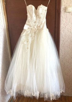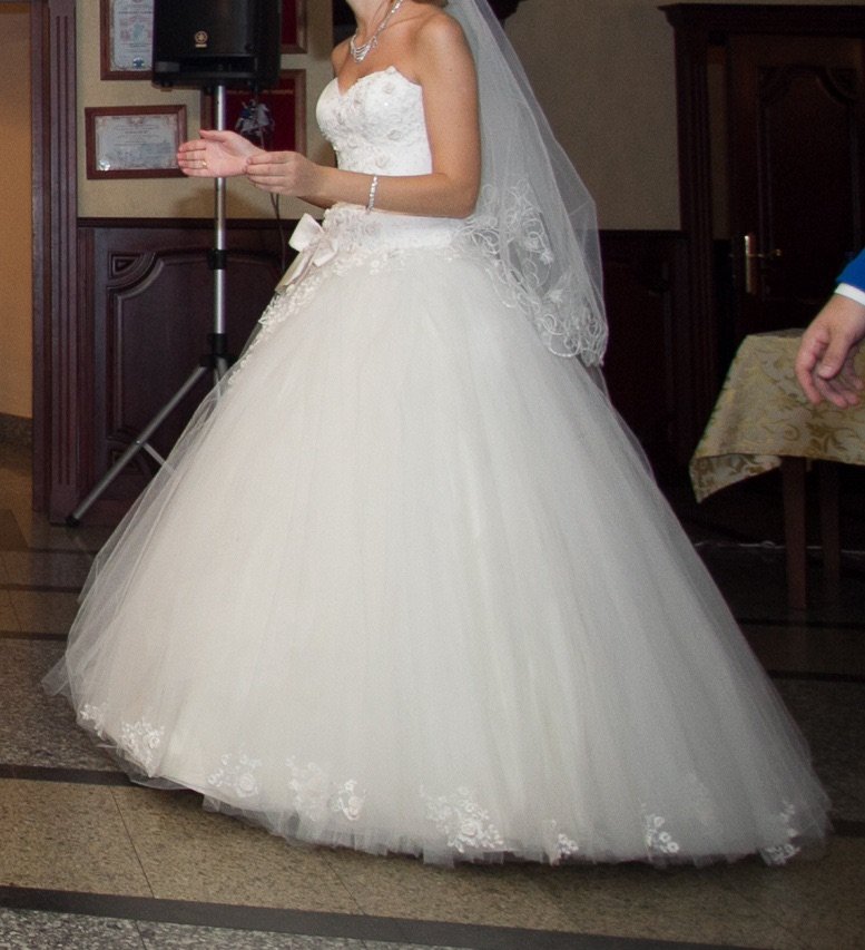 свадебное платье фирмы Viva Deluxe, цвет шампань, корсет. Очень красивая вышивка, стразы и жемчужные бусины. После химчистки, покупала новое и надевала один раз. размер 42-44, 170 см. На фото под платьем юбка на кольцах, она не сохранилась, но платье и без того пышное за счёт фатина. Есть недостаток: когда выходила из лифта , зацепила за батарею и оторвался немного снизу часть подола. Но это не так заметно, на всех фото со свадьбы уже был этот недостаток, в складках фатина вообще не заметен.