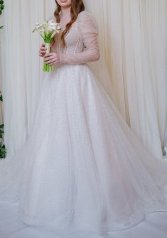 Красивое пышное свадебное платье, покупалось в Москве в магазине «Мери трюфель», из коллекции Натальи Романовой «Дейзи». Свадебное мерцающее платье в идеальном состояние, после химчистки. Надевалось один раз на свадьбу. Идеально подойдет для свадьбы, выпускного или концерта. Очень удобное и воздушное платье, на рост 164-168 идеально. Подойдет на размер XS-S. Отправлю в любой город.