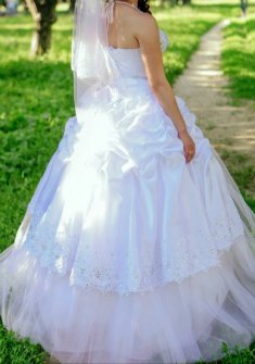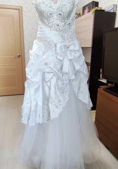 Платье свадебное белое со стразами, без пятен и дефектов, после химчистки При различном освещении стразы красиво переливаются на свету Платье подойдёт от 42 до 46 размера, так как регулируется корсетом. По росту платье регулируется подбором колец. На фото рост 156см