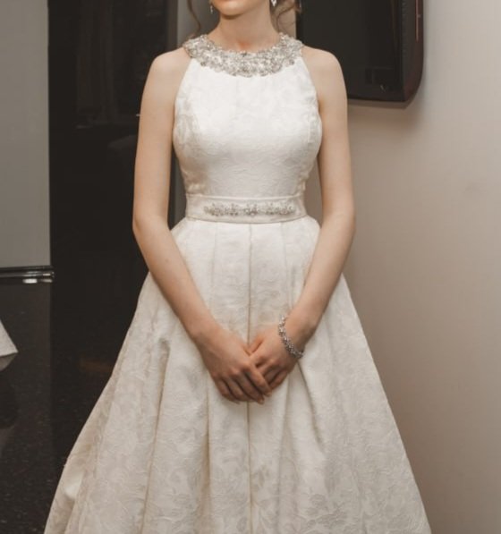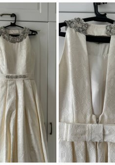 Шикарное платье от "Дома Весты" с открытой спиной, длинным шлейфом, который можно подобрать. Платье в идеальном состоянии, после химчистки. Цвет: айвори, материал жаккард, плотный, роскошный. В подарок подъюбник с кольцом и красивая фата с бисером