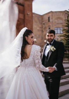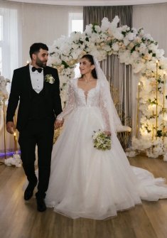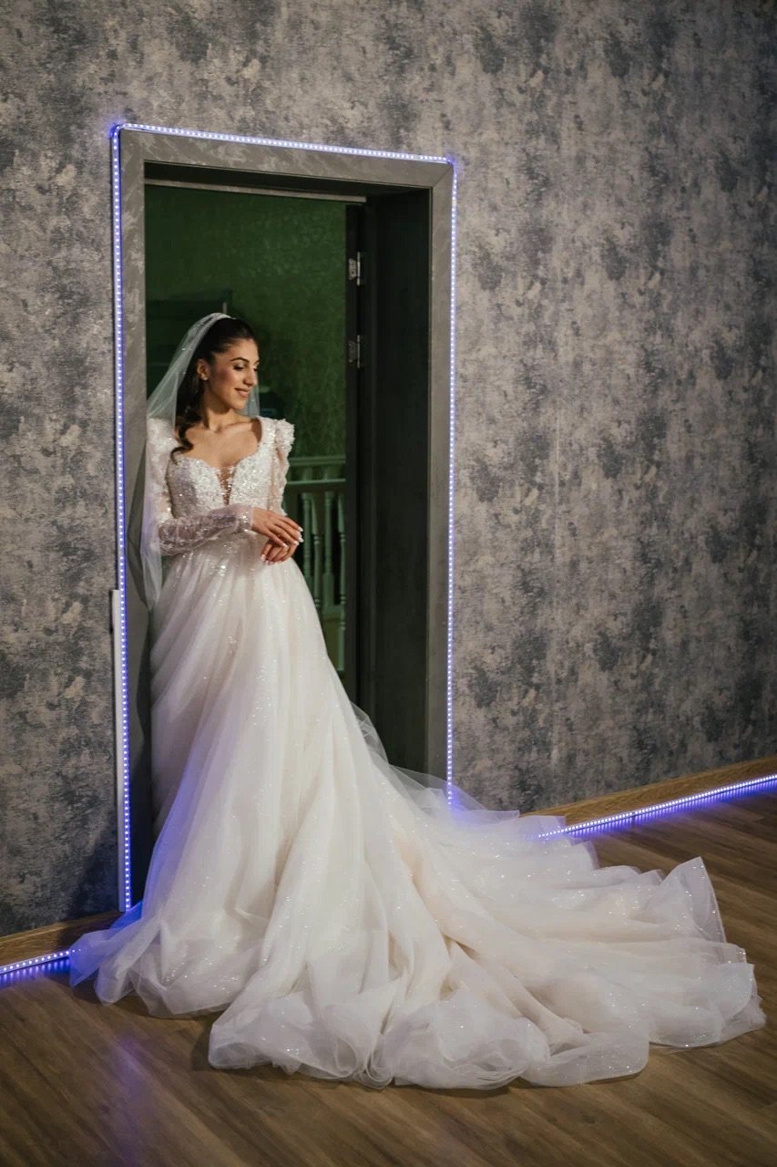 Свадебное платье бального силуэта с длинными рукавами и открытой спиной. Расшито блестящими пайетками и кружевом. Спинка на внутренней шнуровке и молнии. Основной материал: кружево, фатин, пайетки