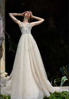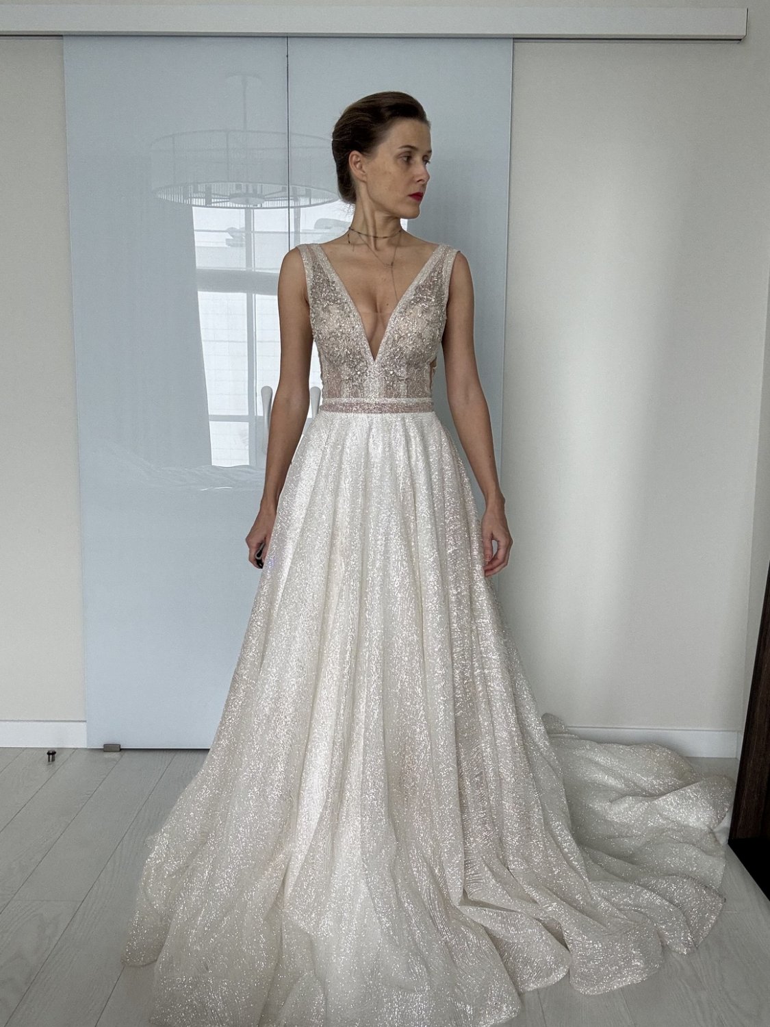 Абсолютно новое платье, есть бирки. НЕ перешивалось/подшивалось, НЕ использовалось ни в каких мероприятиях/фотосессиях. НЕ сдавалось в аренду. НЕ носилось/надевалось. Без дефектов. Свадебное платье А-силуэта на бретелях и открытой спиной из евросетки. Платье покрыто блестящими пайетками, что придает легкое мерцание (особенно эффектно смотрится при приглушенном свете, словно невеста сияет). Пышная мерцающая юбка заканчивается роскошным шлейфом. Чехол и плечики в комплекте.