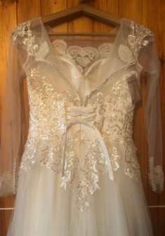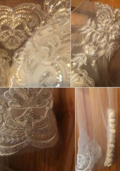 Подол вышит пайетками и всё платье расшито ими, а также вышивка нитями (узоры). Аккуратные манжеты на классических тканевых пуговках и также сделана пуговками спина. есть потайная молния, чашка лифа плотная и правильной формы, бюстгалтер не требуется 7-мислойная юбка: 1 - сетка с вышивкой и пайетками и ещё 4 слоя сетчатой ткани, жёсткая(в меру) 2 - 2 слоя белой шелковистой (полиэстер) ткани нижней юбки