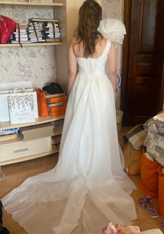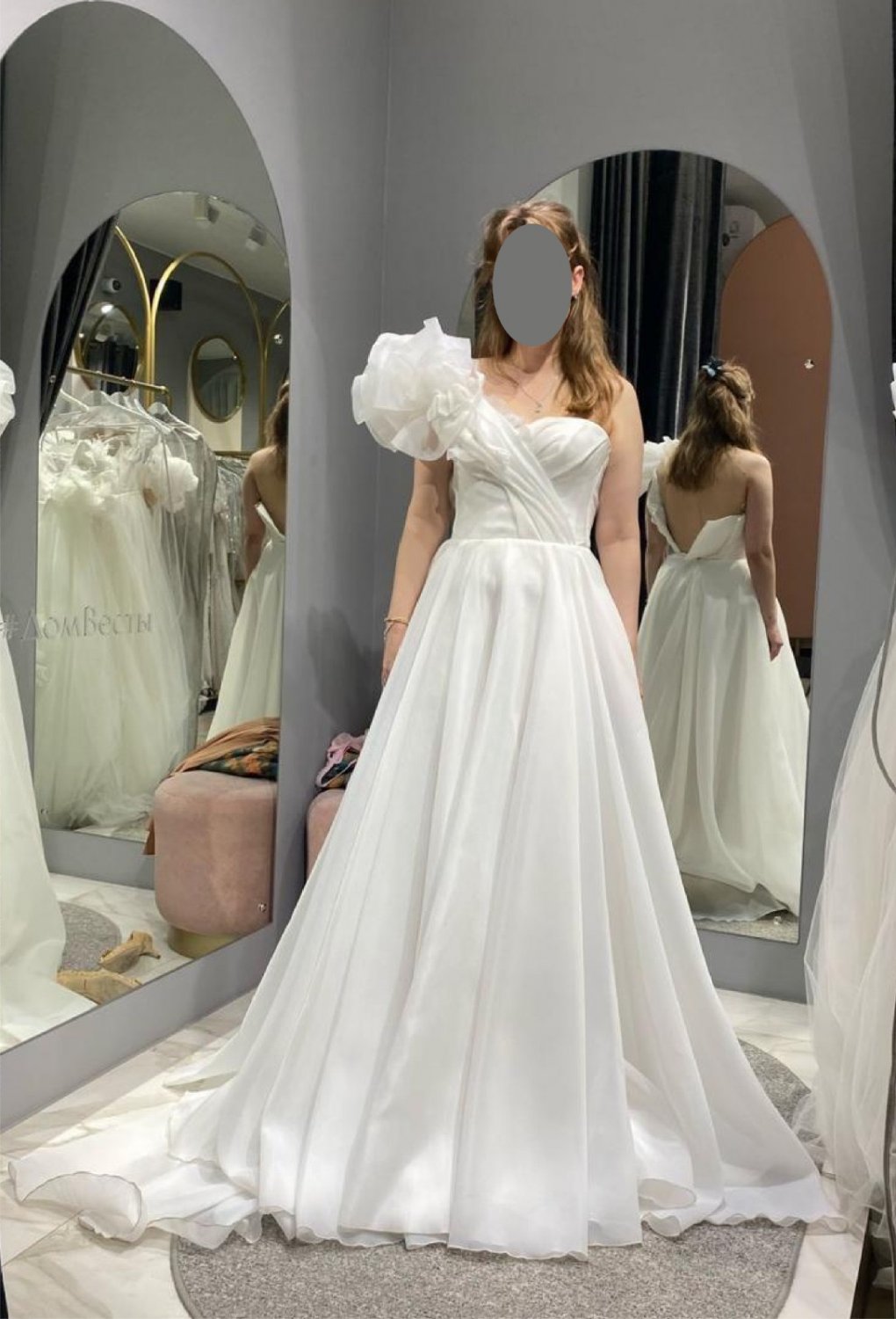 Очень эффектное свадебное платье размера 44-46 от Дом Весты. Белое платье с корсетом, подчеркивающим фигуру, и драпировкой на лифе и большим асимметричным цветком на плече. Платье в отличном состоянии. Подходит для роста до 180 см. Платье покупала за 86.000 и фата 7.000. Отдам фату в подарок при покупке