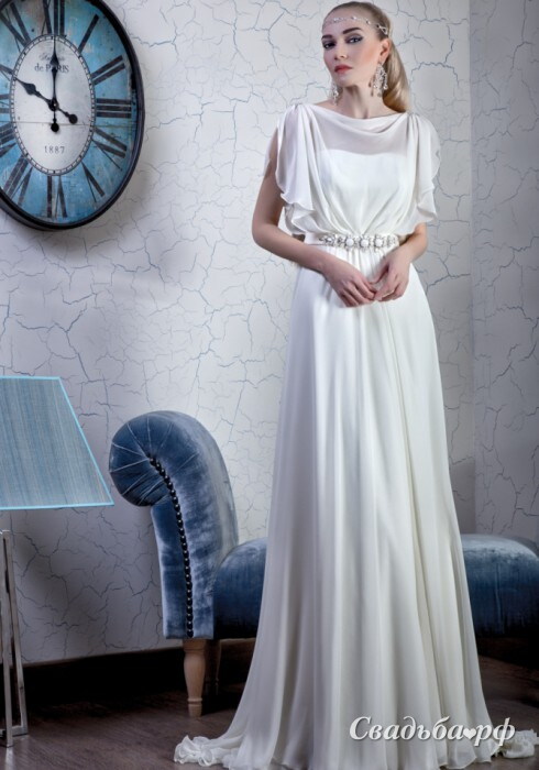 Если вы хотите почувствовать себя настоящей греческой богиней, то представленное свадебное платье из лёгкого шифона создано специально для вас. Оригинальный верх наряда дополнен изящным поясом и необычными рукавами. Длинная юбка со множеством складок струится до самого пола. Модель зрительно вытягивает силуэт.
